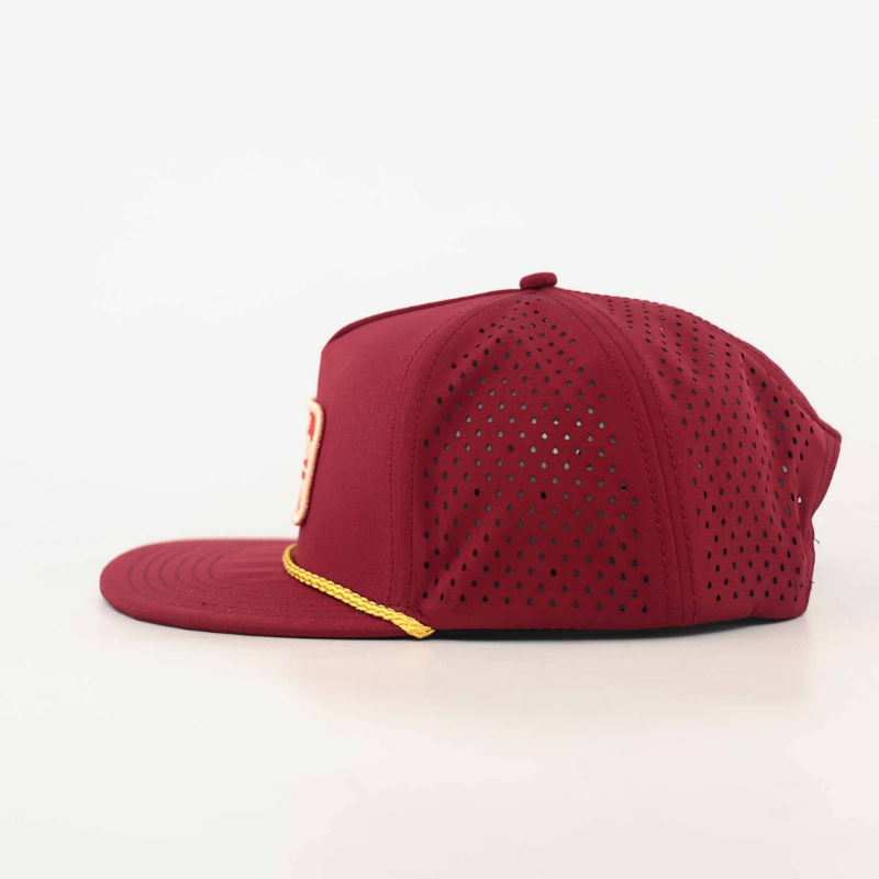 Specs: Classic 5 panel snapback cap in performance style and semi-structured shape, featuring waterproof material and perforated panels for venting.